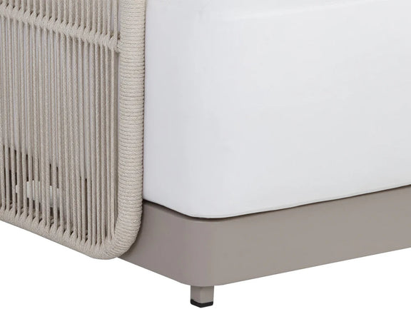 Introduce refined modern style outside with this impressive sofa from the Outdoor by SUNPAN collection. Upholstered in stinston white fabric with a powder-coated greige aluminum frame. Completed with cream rope weaving on the seat exterior.
