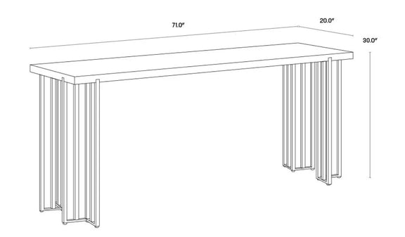 This console table from our MIXT collection will bring warmth and style to various living and lounge spaces. The oak wood veneer top is complemented with architectural antique brass iron legs for added appeal. Cracks and deep lines in finish are part of the distressed look. Suitable for residential and contract environments.