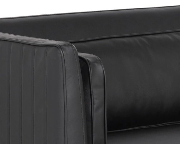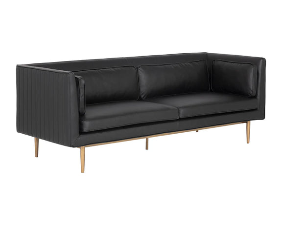 Inspire conversation while seated in this bold sofa. Streamlined and refined, this design features a seat in vintage black faux leather with channel tufting on the exterior. Sleek piping and a bronze steel base complete the look. Includes four cushions. Coordinating armchair also available. Handle With Care: This design has been crafted with faux leather. Faux leather is manufactured to reflect the natural characteristics of leather; as such, colour variations, markings, wrinkles, grooves, and light scratches are appreciated characteristics. No two pieces will be alike. Visit our Product Care page for more information on how to ensure the lasting beauty of this piece.