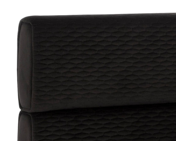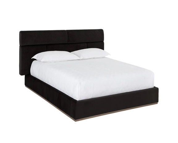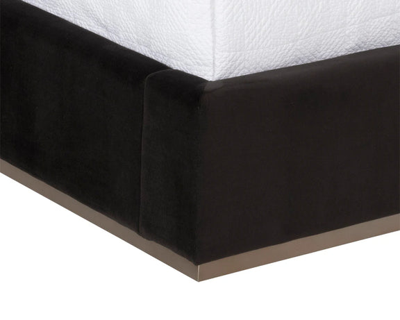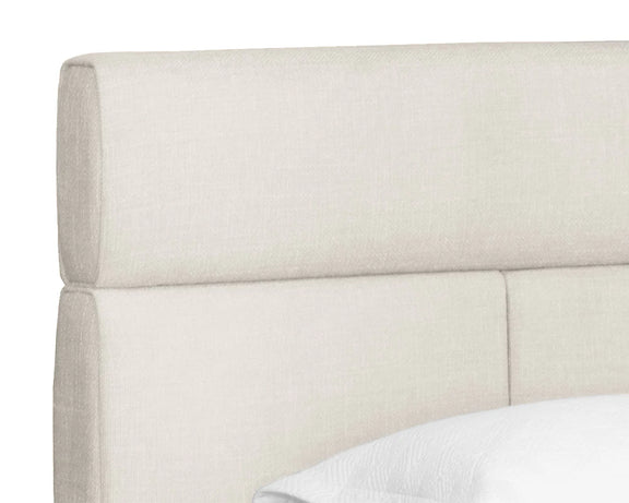 A stylish modern bed that features horizontal and vertical tufting on the headboard. Stocked in chacha cream fabric and complemented with a stainless steel base in an antique brass finish. No box spring is required and slats are included.