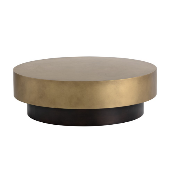 This stunning round coffee table from our Ikon collection exudes contemporary elegance. Features a metal top in an antique brass finish supported by a wood base. Suitable for residential and commercial living and lounge environments.