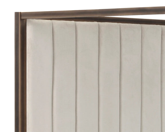 Boasting a regal design, this classic bed features a grand canopy frame that will certainly add a stunning appeal to any bedroom space. Upholstered in our piccolo processo performance fabric and features vertical tufting on the headboard. Completed with a rustic bronze iron frame. No box spring is required and slats are included. Performance fabric is moisture repellent, durable and easy to clean.