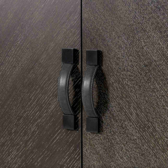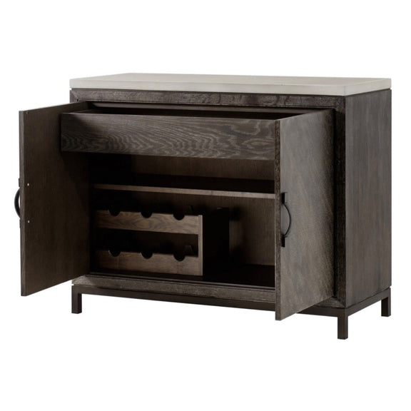 Exuding a modern, relaxed elegance; this handcrafted credenza is made from a combination of hardwoods contrastic with a contemporary white concrete effect, and a square tube frame crafted from steel in a bronze finish, adds a striking twist to this piece, while stitched leather door handles add a touch of old-world glamor. The top drawer is lined with felt, and fitted with a removable cutlery tray, for modern convenience.