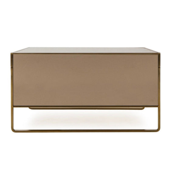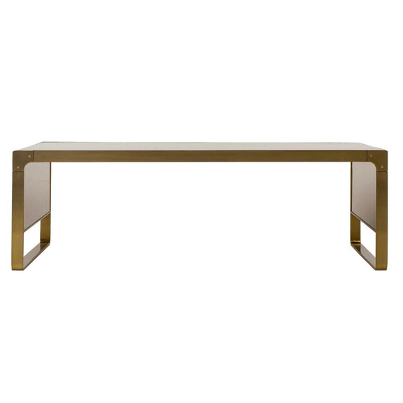 A stainless steel rectangular table, finished in satin brass, and with a bronze glass top and sides conveys relaxed glamor.