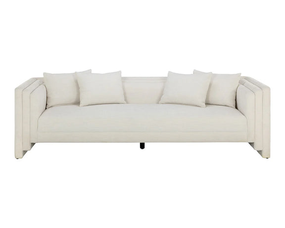 Artfully designed with soft geometric lines, the Kira Sofa evokes a distinctly modern style. Fully upholstered in our meg gold fabric, this sofa is velvety soft.