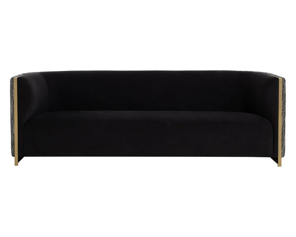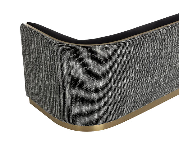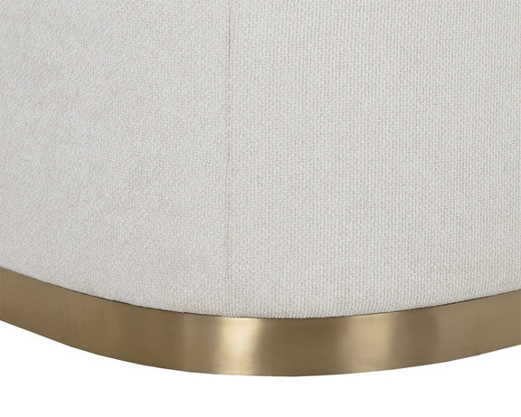 The Larron Sofa balances mixed materials to bring this contemporary design to life. Expertly upholstered in rhea light barley performance fabric for a soft touch. Gold stainless steel metal inlay and padded curves accentuate the chair's curved silhouette. Performance fabric is moisture repellent, durable and easy to clean.
