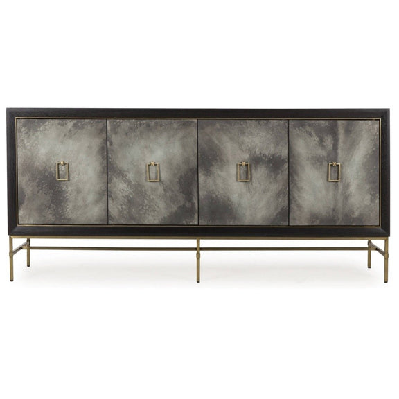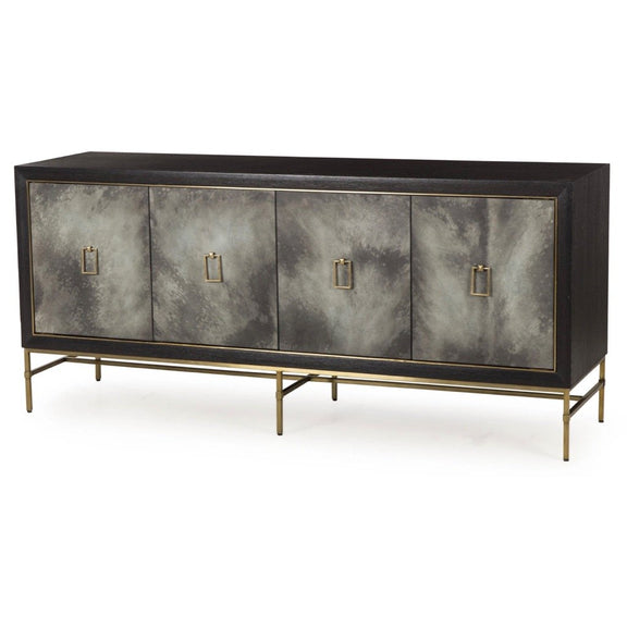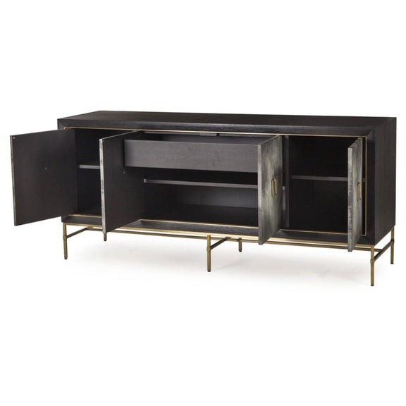 The Levi Credenza is a statement piece, crafted from a unique blend of Ebonized Ash. Faux velum door panels in striking charcoal, with hardware accents in satin brass trim, add a touch of glamor. Four doors with push catches and drawer inside provides ample storage