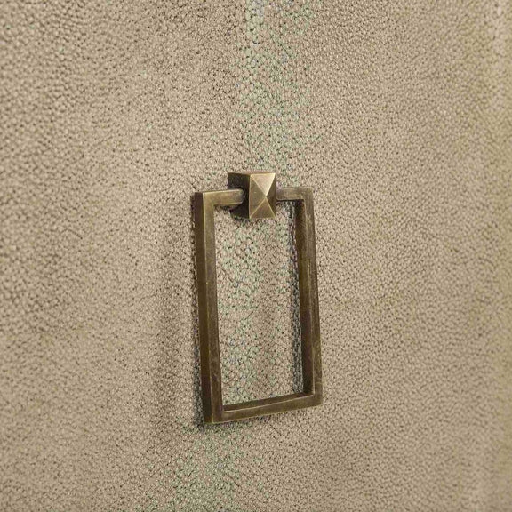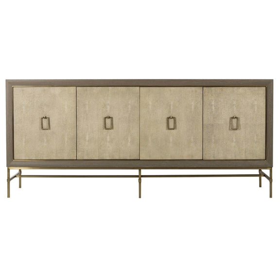 This beautiful credenza is striking from all angles, finished in a unique combination of Ash veneer top and side panels and ivory faux shagreen paneled door fronts. Hardware detailing and frame is crafted from satin brass finished iron. Four doors with push catches and solid shelving and drawer inside provides ample storage. Due to the nature of shagreen, the coloring may vary from one piece to another, these differences add to the natural beauty of the product. The color may also vary with time.