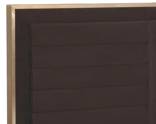 This richly designed bed will add warmth to any bedroom space. Upholstered in our meg dark brown fabric with horizontal and vertical tufting on the headboard. Finished with gold feet. No box spring is required and folding slats are included. Due to the reflective nature of metal, some images on our website may not capture the artisanal characteristics of a product accurately
