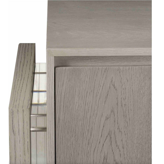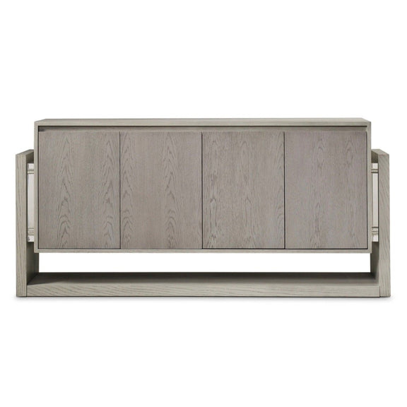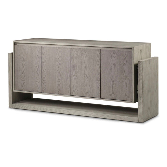 A pale two-tone palette dominates in the Newman four-drawer sideboard, with a gray oak frame and whitewashed oak drawers that appear to float effortlessly thanks to acrylic spacer detail between the cabinet body and frame.