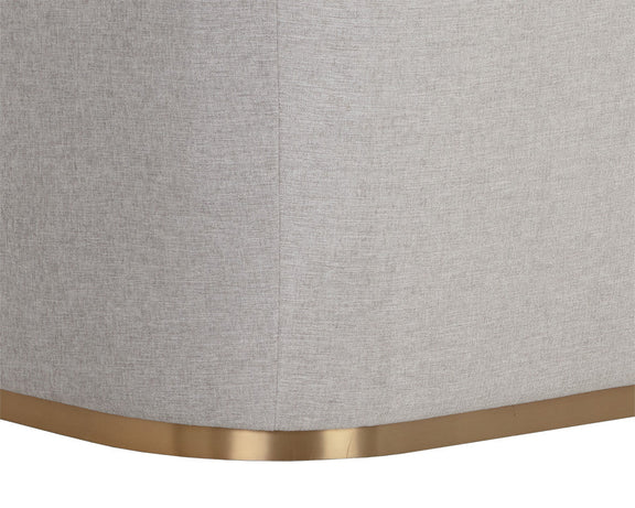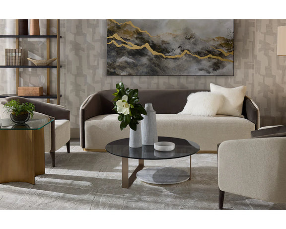 With an alluring seatback, the Sheva Sofa will add a touch of comfort to any space. Features an upholstered exterior and seat in ernst silverstone fabric, and completed with coordinating meg ash fabric on the interior seat. A powder-coated steel base provides an elegant accent to the overall look