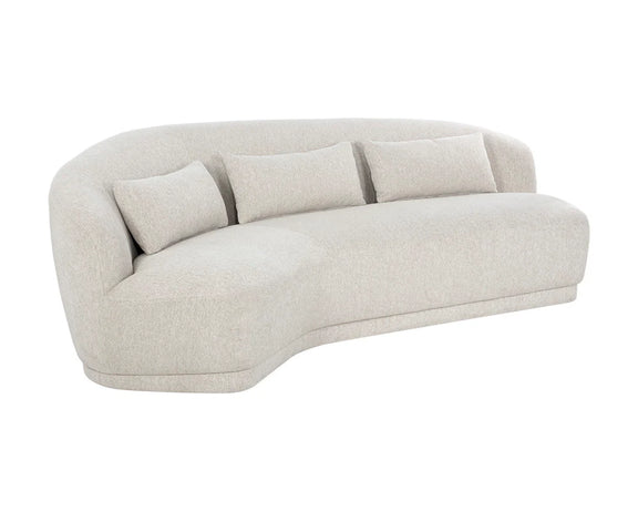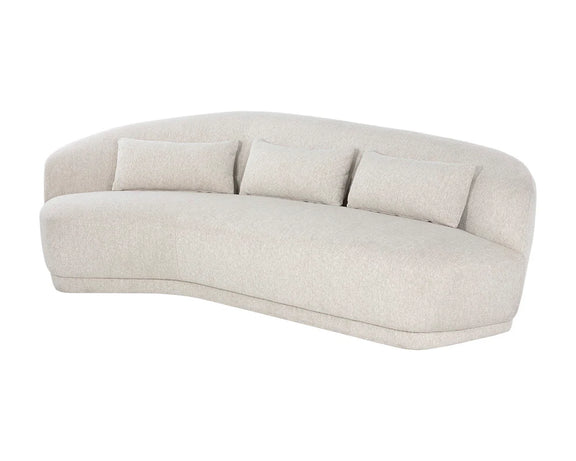 his marvelous sofa will add shape to any space. Stocked in dove cream fabric and completed with a wooden frame. Includes three pillows. Coordinating swivel armless chair and ottoman also available.