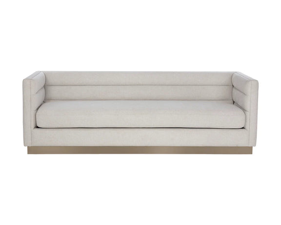 This stunning sofa offers a streamlined design for contemporary elegance. Stocked in belfast oatmeal fabric with horizontal tufting on the interior seatback. Completed with an antique brass stainless steel base