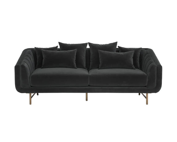 A beautiful sofa that exudes luxurious mid-century modern style. Designed with channel tufting on the seatback in shadow grey fabric or polo club muslin performance fabric and finished with antique brass metal feet. Comes with 6 cushions for added comfort.