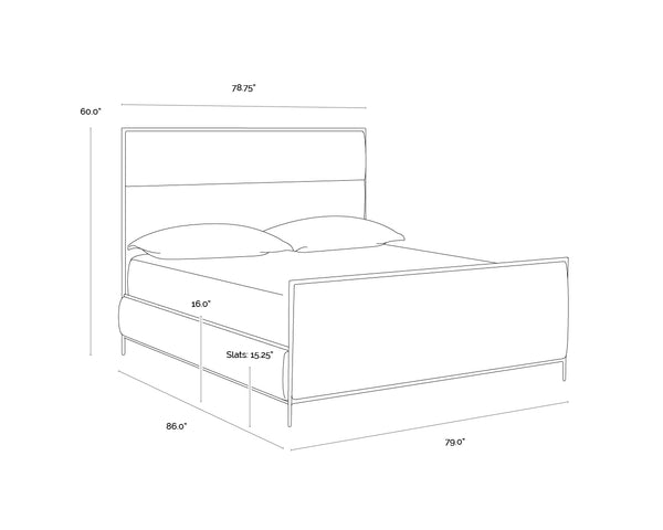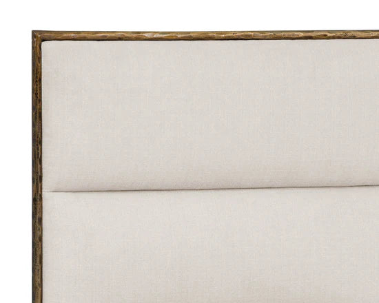 The Yasmine Bed effortlessly combines the textured look of hand-hammered metal with tailored upholstery to bring a curated sense of comfort to any bedroom. Handcrafted with an antique brass metal frame and beautiful zenith alabaster performance fabric. Performance fabric is moisture repellent, durable and easy to clean. No box spring is required and folding slats are included. Made in India. With refined craftsmanship, this design was brought to life by skilled local artisans. Due to the nature of handcraftsmanship, unique imperfections such as fissures, markings and variations in colour and shape are welcomed and appreciated characteristics for a truly one-of-a-kind piece.
