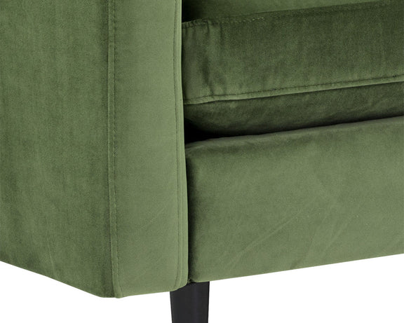 This structured sofa will make a bold and comfortable statement in any space. Features a seatback with channel tufting in velvet moss green or smokescreen grey fabric. Finished with espresso wood legs and brushed antique brass caps